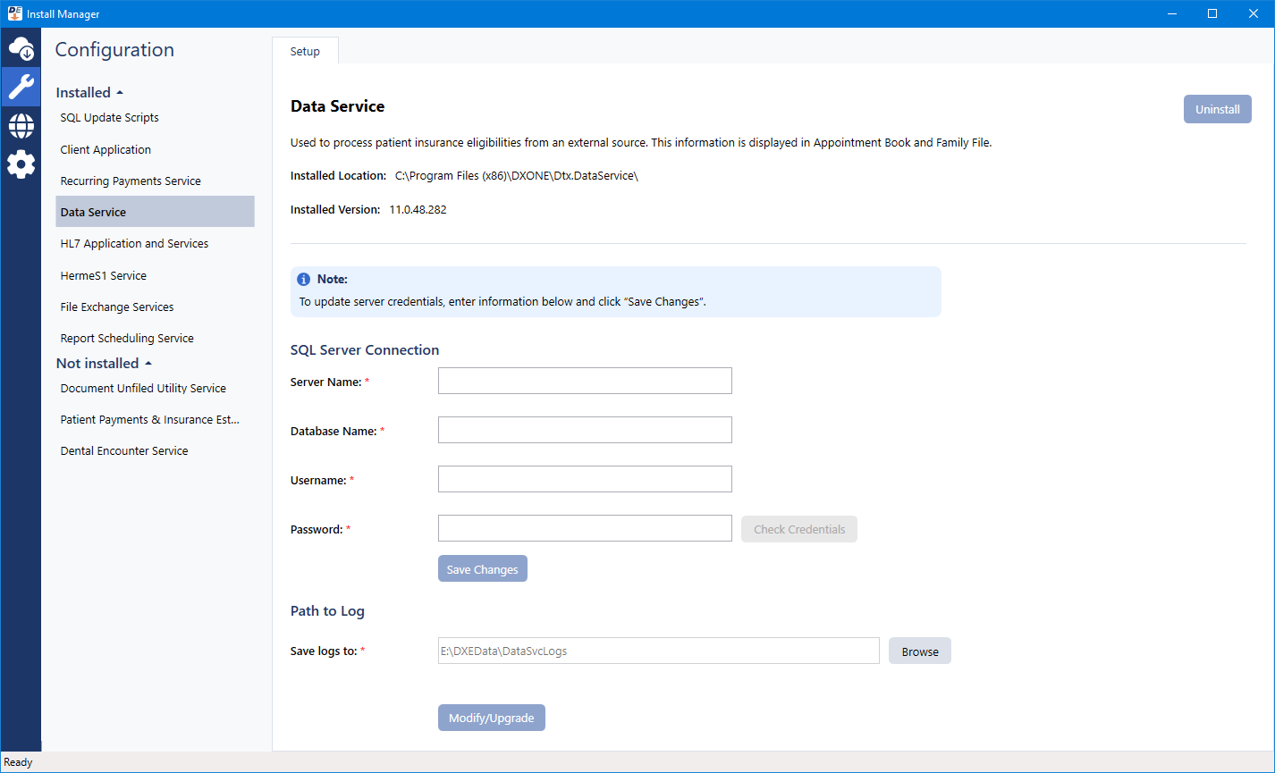 Data Service - Enter the SQL Server Connection details. If necessary, change the folder where you want to Save logs to. Click Modify/Upgrade.