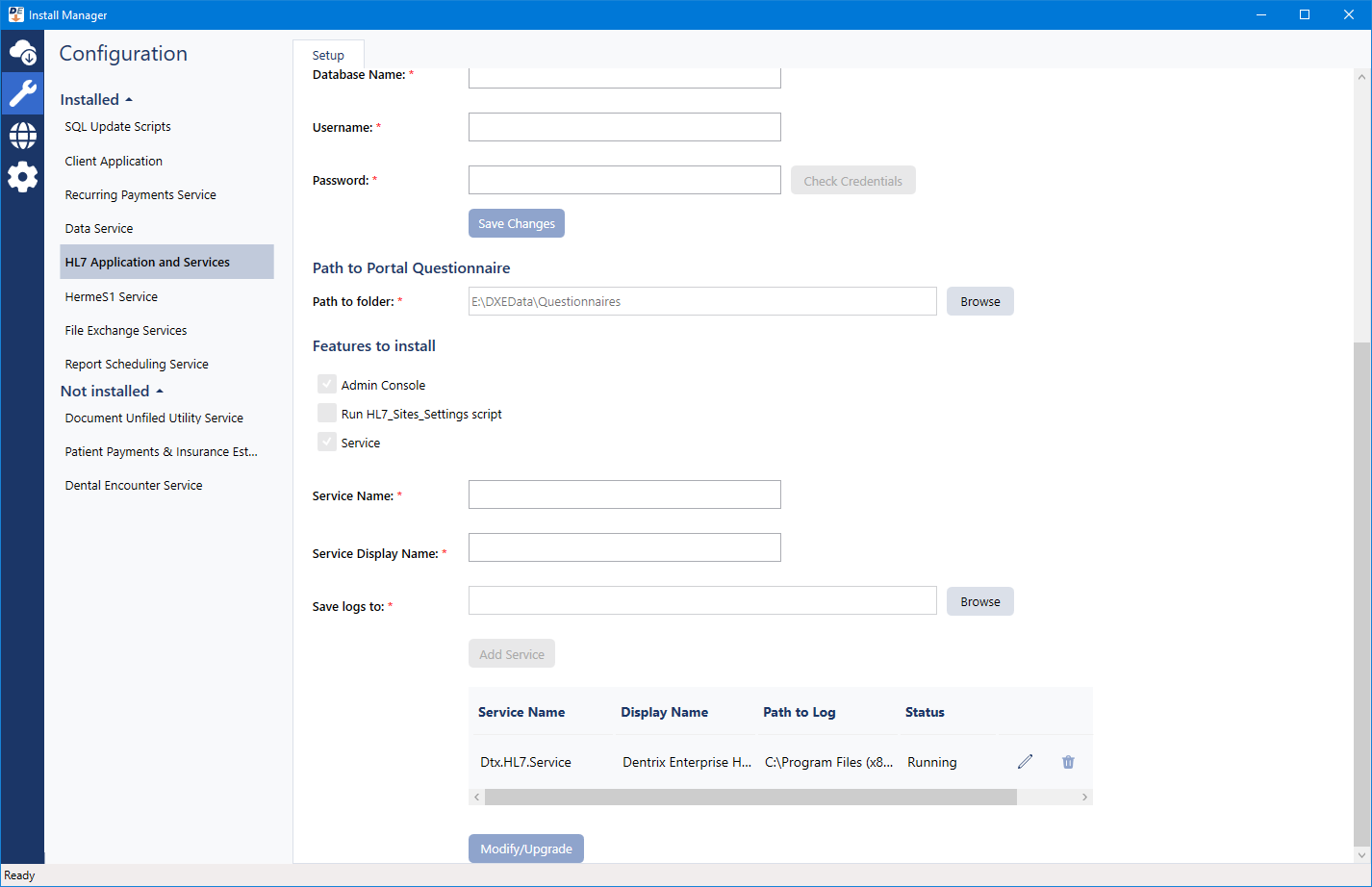 HL7 Application and Services - Enter the SQL Server Connection details. If necessary, for Path to Portal Questionnaire, change the folder where you want to store portal questionnaire data. Click Modify/Upgrade.