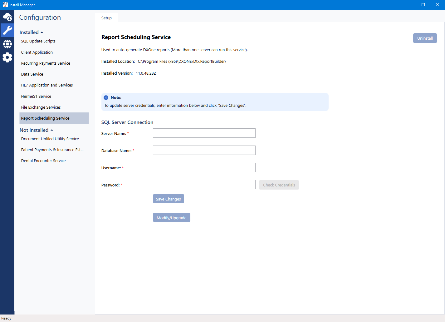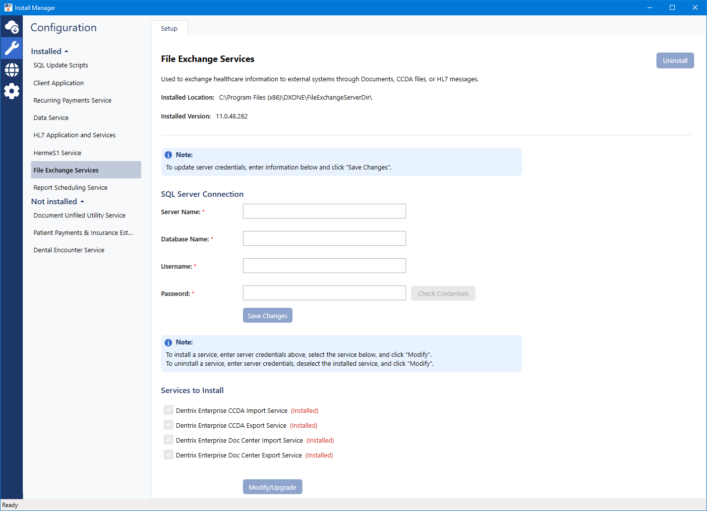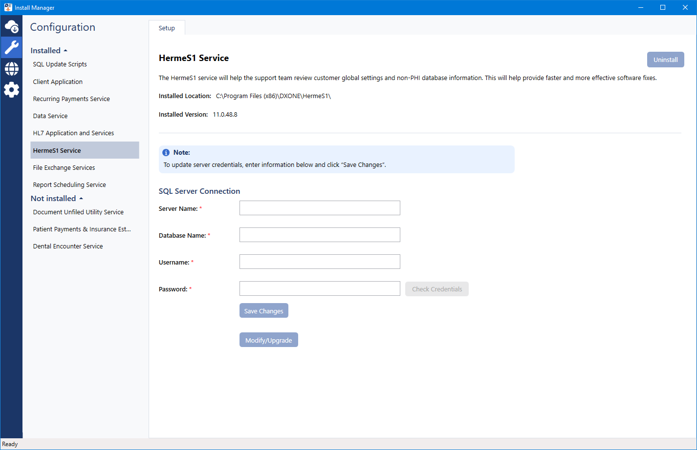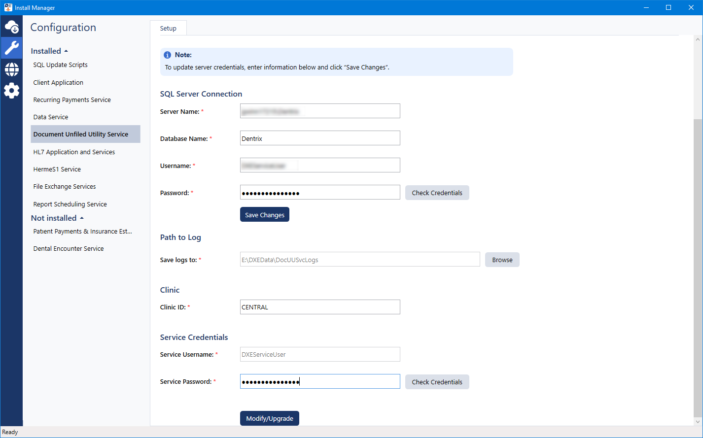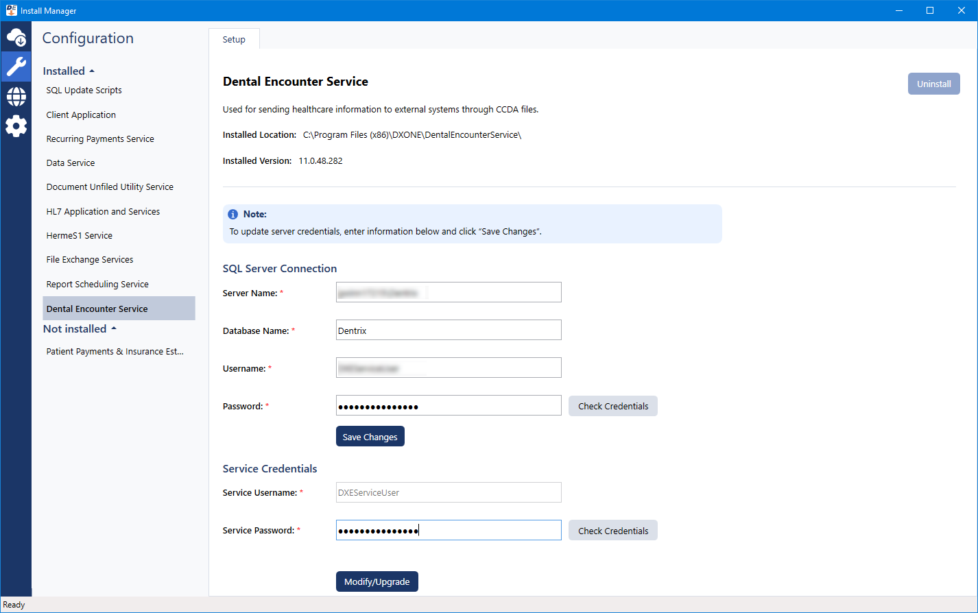 Dental Encounter Service - Enter the SQL Server Connection details. Enter the Service Password under Service Credentials. Click Modify/Upgrade.