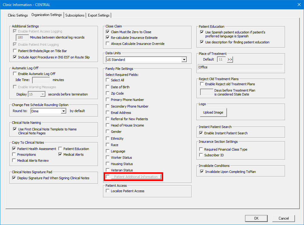 There is now a Patient Additional Information option under Family File Settings on the Organization Settings tab of the central clinic's Clinic Information dialog box (in Office Manager, go to Maintenance > Practice Setup > Clinic Resource Setup, and then click Edit under Clinic Information).
