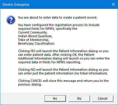 Clicking No opens the Patient Information dialog box so you can enter just the patient information (no tribal information) and then click OK. Later, you can edit the patient's record to enter the required information for NPIRS reporting.