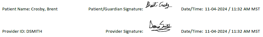 In the signature section, for the patient and provider signature lines, the date/time is displayed in a12-hour format and contains AM/PM and the system time zone (for example "Date/Time: 11-04-2024 / 11:32 AM MST").