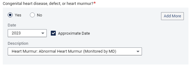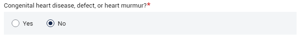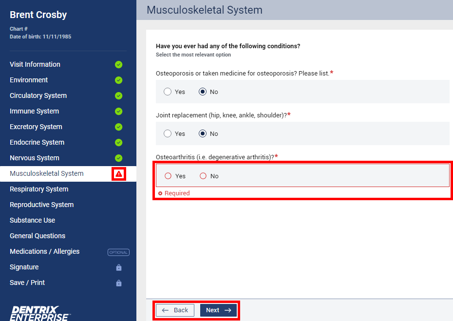 If there is missing required information on the current tab, and you click Back or Next, you stay on the current page, and the unanswered required questions are given a red outline (this is existing functionality); now a red triangle icon also appears on the left (this is new functionality).