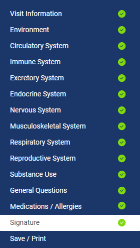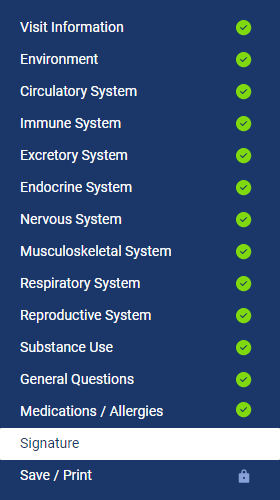 While Visit Information through General Questions are incomplete, a lock icon appears for Signature and Save/Print. You cannot visit those pages yet.