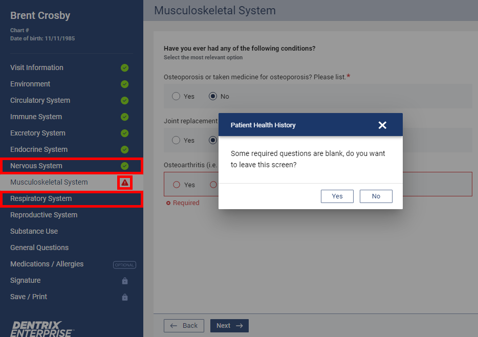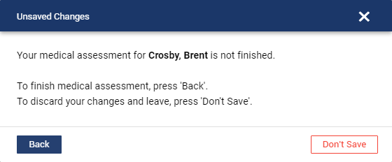 Also, if you open the Dental Patient Medical Assessment window for patient A from Family File, More Information, Chart, or Ledger, and then change from patient A to B in Family File, More Information, Chart, or Ledger, the Dental Patient Medical Assessment window for patient A remains open. However, if you then try to open the Dental Patient Medical Assessment window for patient B, a confirmation message appears if patient A's assessment is not finished.
