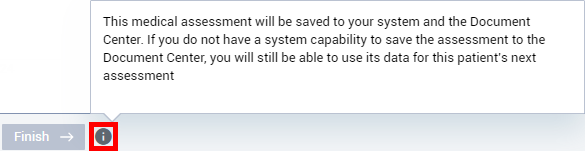 On the Signature tab, there is now an "i" icon next to the Finish button. When you click the icon a tooltip appears, explaining the functionality of the button: "This medical assessment will be saved to your system and the Document Center. If you do not have a system capability to save the assessment to the Document Center, you will still be able to use its data for this patient’s next assessment."