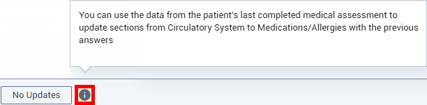 On the Circulatory System tab, there is now an "i" icon next to the No Updates button. When you click the icon a tooltip appears, explaining the functionality of the button: "You can use the data from the patient's last completed medical assessment to update sections from Circulatory System to Medications/Allergies with the previous answers."