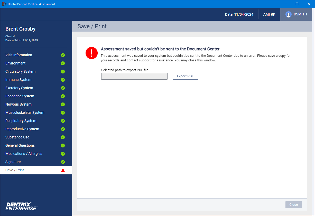 A red triangle indicates that the assessment was saved in the database, but a .pdf copy was not saved in the patient's Document Center record.