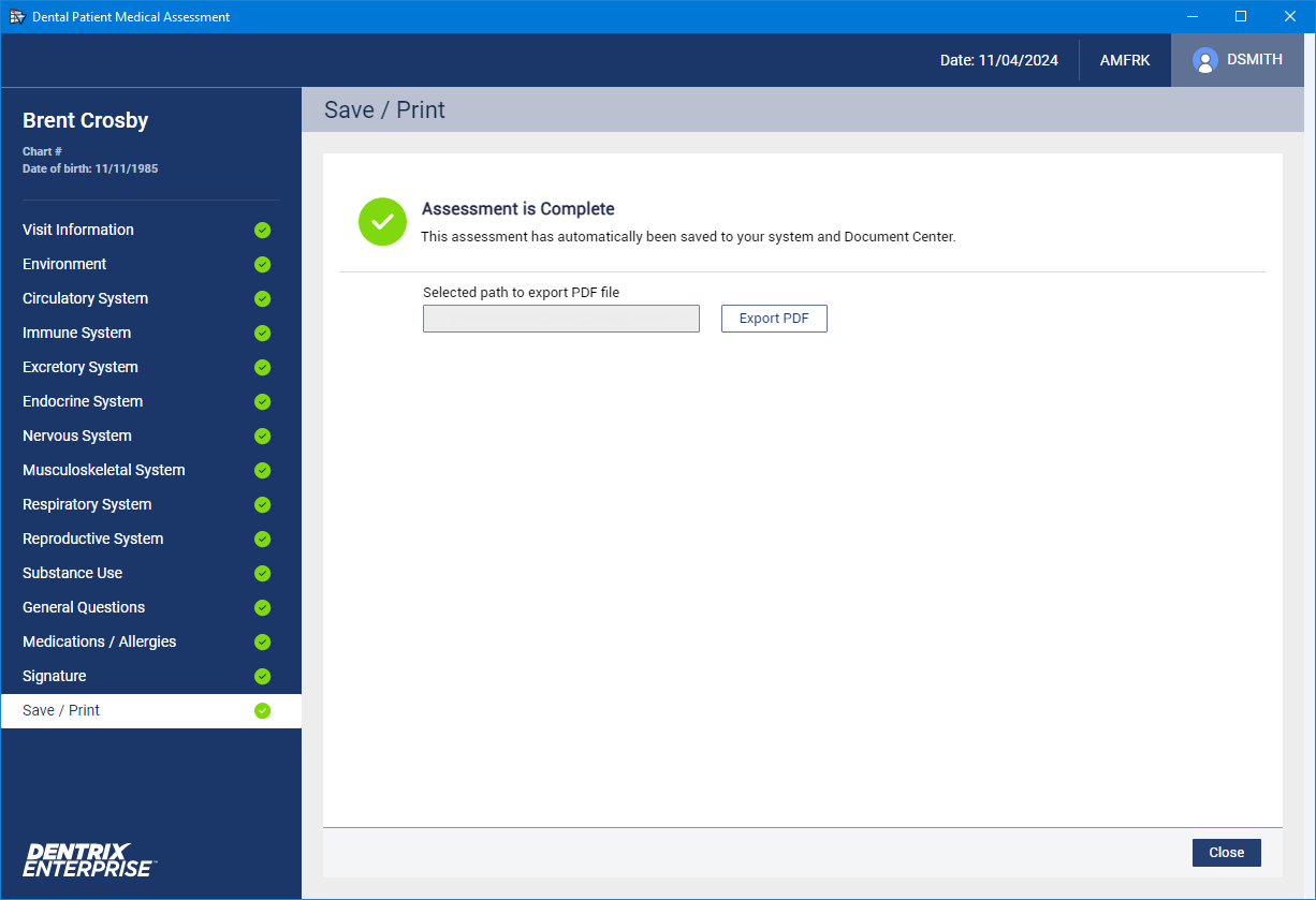 Now, after you click Finish on the Signature page, the assessment is saved to the database, and a copy is saved to Document Center automatically. Then, you are taken to the Save/Print tab automatically.