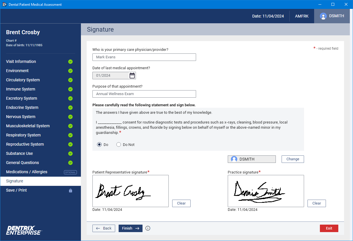 Signature tab changes - On the Signature tab, the Next button has been replaced with a Finish button. On the Signature tab, there is now an "i" icon next to the Finish button. Now, after you click Finish on the Signature page, the assessment is saved to the database, and a copy is saved to Document Center automatically. Then, you are taken to the Save/Print tab automatically.