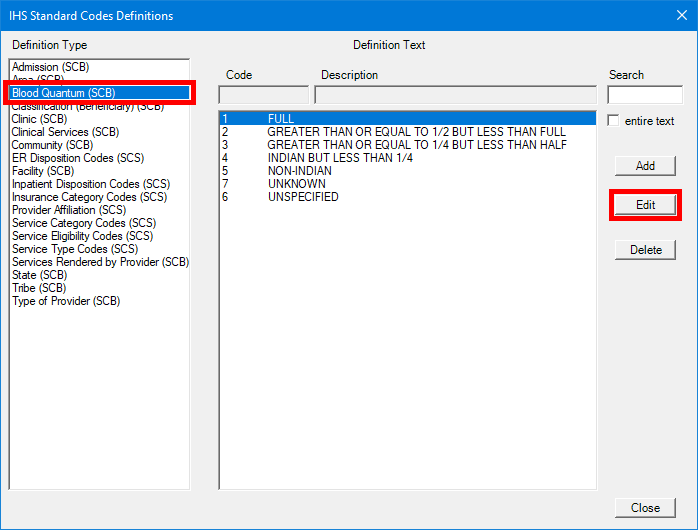 In the IHS Standard Codes Definitions dialog box (In Office Manager, go to Maintenance > Practice Setup > IHS Standard Codes Definitions), for the Blood Quantum (SCB) definition type/category, an Edit button now appears when a definition in that category is selected. With a blood quantum definition selected, click Edit.