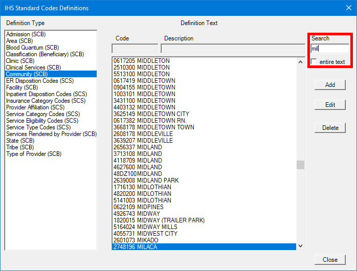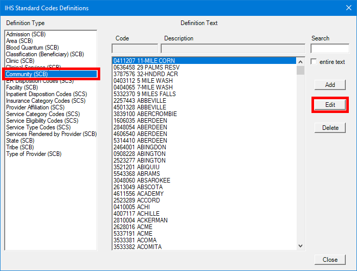 In the IHS Standard Codes Definitions dialog box (In Office Manager, go to Maintenance > Practice Setup > IHS Standard Codes Definitions), with the Community (SCB) definition type/category selected, select a definition, and then click Edit.