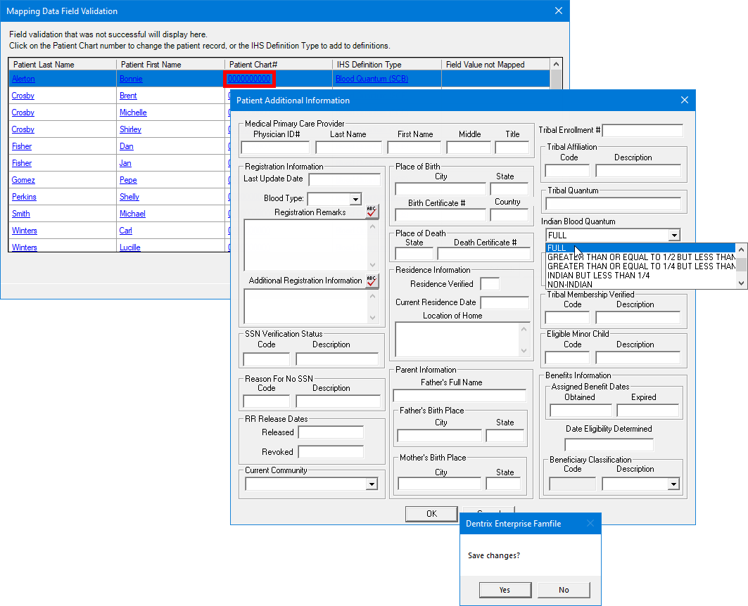 Viewing/updating additional patient information during validation - In the Mapping Data Field Validation dialog box of the NPIRS data extraction utility, for blood quantum, when you click a link in the Patient Chart # column, the Patient Additional Information dialog appears. Also, for beneficiary classification, community, or tribe, when you click the link in the Patient Chart # column, in the Change Patient Record dialog box that appears, there is now a list to select an option.