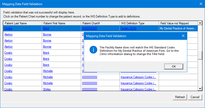 In the Mapping Data Field Validation dialog box of the NPIRS data extraction utility, if a clinic title appears in the Field Value not Mapped column, if you click in the link in the Patient Chart # column, a message appears. The wording of that message has been updated to explain how you should handle an empty or an unmatched value (the clinic title does not match the facility name in the IHS standard code definitions).