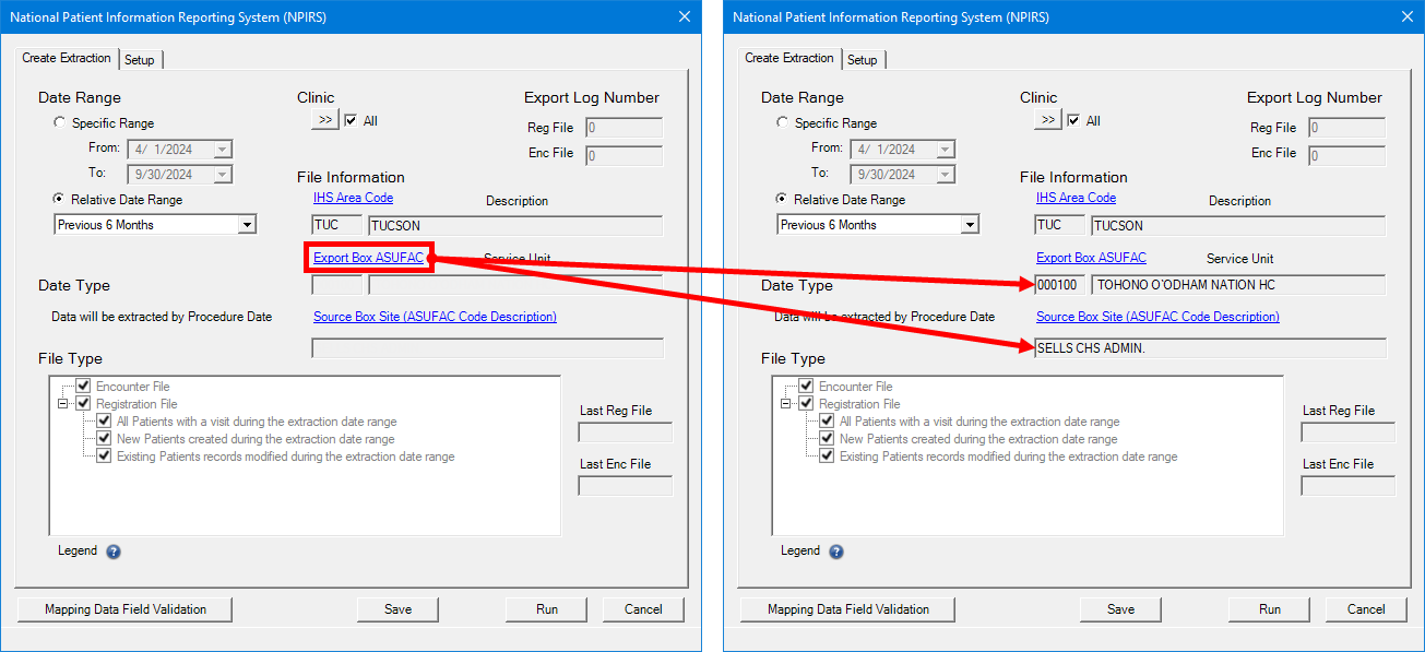 New wording of unmatched-facility message during validation - In the Mapping Data Field Validation dialog box of the NPIRS data extraction utility, if a clinic title appears in the Field Value not Mapped column, if you click in the link in the Patient Chart # column, a message appears. The wording of that message has been updated to explain how you should handle an empty or an unmatched value (the clinic title does not match the facility name in the IHS standard code definitions).