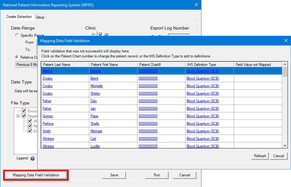 The new fields (Indian Blood Quantum Field and Current Community Field) for the Blood Quantum and Community definitions are validated against patient records when you run the NPIRS data extraction utility (in Office Manager, go to Data Extraction > National Patient Information Reporting System (NPIRS)). If blood quantum and community values exist in a patient's record, in the Mapping Data Field Validation dialog box (in NPIRS, click Mapping Data Field Validation), entries for the patient for those definition types will not appear; otherwise, entries for the patient for those definition types will appear.
