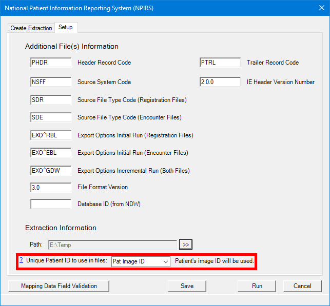 On the Setup tab of the NPIRS data extraction utility, a list has been added: Unique Patient ID to use in files. From the list, select the ID type to use for the patient export (Pat Image ID, Pat External ID, Chart Number, Social Security #, or Other ID).