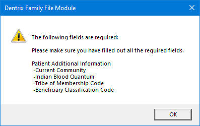 Requiring additional patient information - You can now require Current Community, Indian Blood Quantum, Tribe of Membership Code, and/or Beneficiary Classification Code to create patient records in Family File.