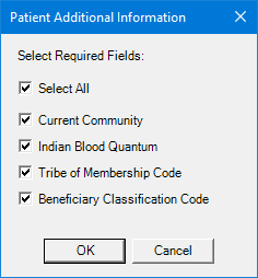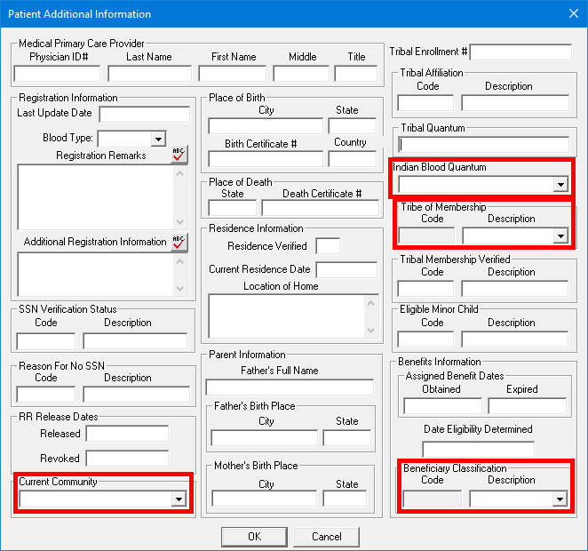 Selecting additional patient information - In the Patient Additional Information dialog box that you access from Family File, the boxes for the following options have been replaced with lists so you can quickly select the correct IHS standard code definitions instead of having to manually type them: Current Community, Indian Blood Quantum, Tribe of Membership, and Beneficiary Classification.