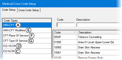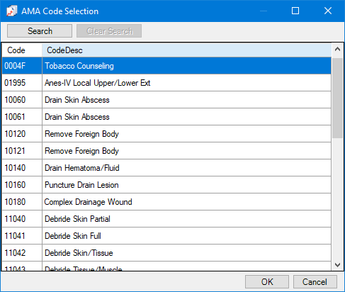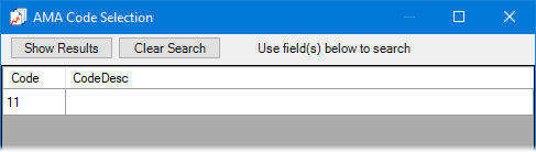 Enter the first character or more of an AMA-CPT code and/or description in the Code and CodeDesc boxes, respectively.