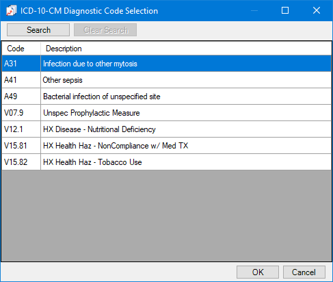 The ICD-10-CM Diagnostic Code Selection dialog box appears.