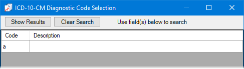 Enter the first character or more of an ICD-10-CM code and/or description in the Code and Description boxes, respectively.