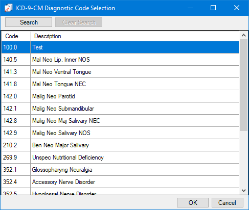 The ICD-9-CM Diagnostic Code Selection dialog box appears.