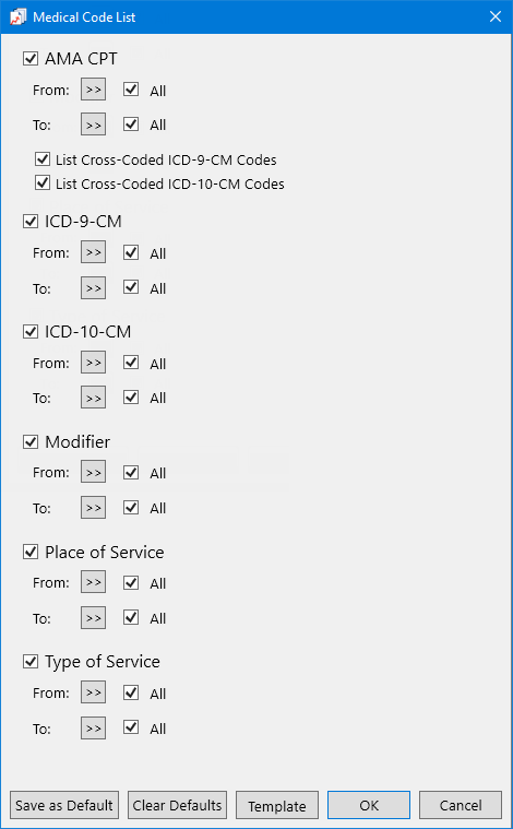 To include all AMA-CPT codes, select the All checkbox for both From and To.