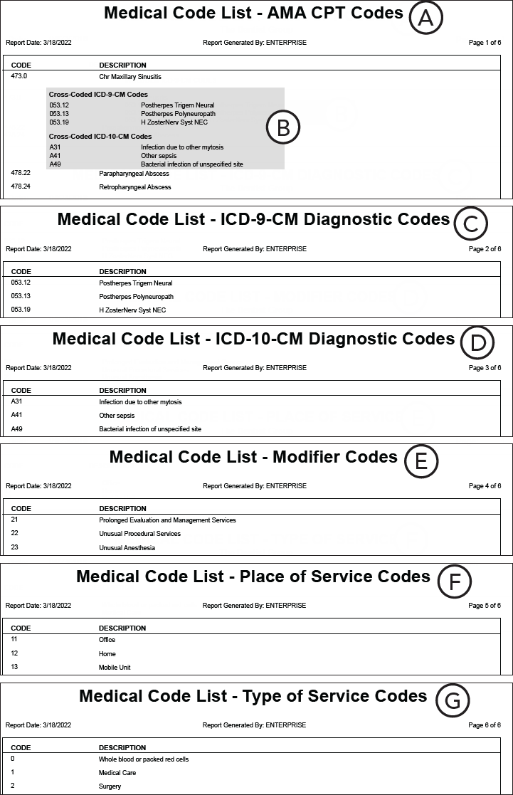 The Medical Code List allows you to view and print the medical codes that have been entered in Dentrix Enterprise. Codes are grouped by code type (AMA, ICD, Modifier, Place of Service, and Type of Service).