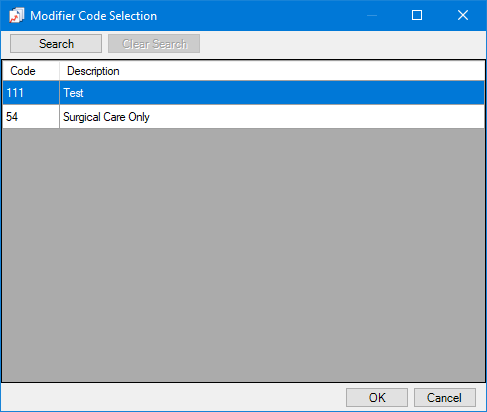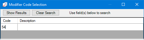 Enter the first character or more of a Modifier code and/or description in the Code and Description boxes, respectively.