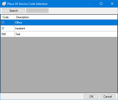 Enter the first character or more of a Place-of-service code and/or description in the Code and Description boxes, respectively.