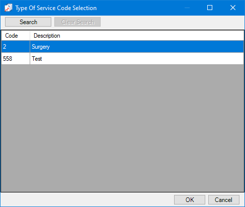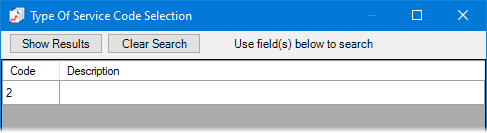 Enter the first character or more of a Type-of-service code and/or description in the Code and Description boxes, respectively.