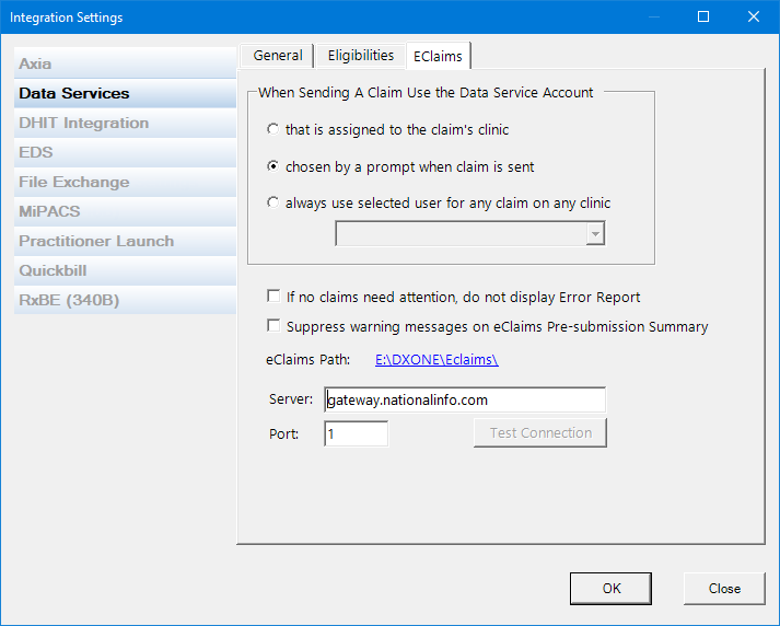 Note: The eClaims Path, which is where the eTrans program files are installed, appears for your reference.