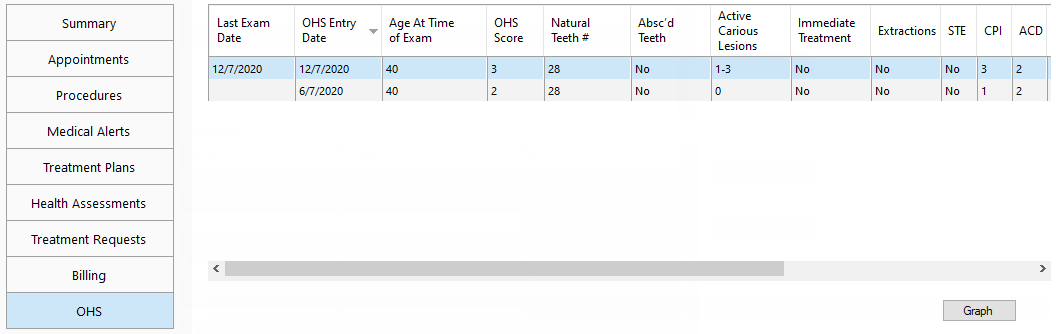 The OHS tab of More Information lists a patient's OHS surveys, which you can view and edit the responses for.