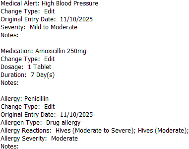 Medical alerts (problems), medications, and allergies that were changed and some details for each.