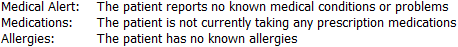 For a "none" response to problems - "Medical Alert: The patient reports no known medical conditions or problems"