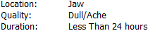 "Location: [Tooth, Gingiva/Gums, Jaw, Headache, and/or Other (patient specified: {text})]"
