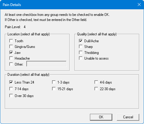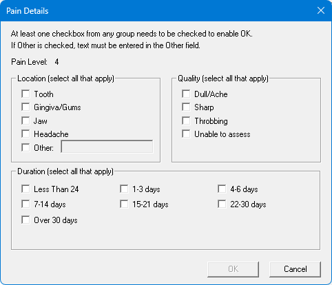 To specify pain details, select at least one checkbox in any of the groups, and then click OK.