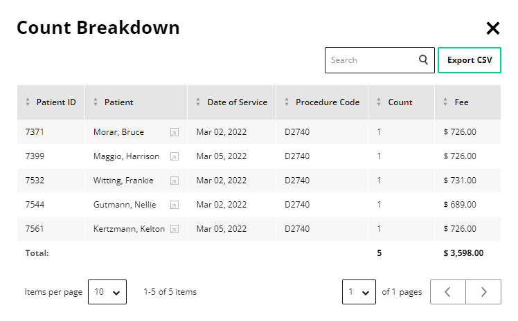 6. To export the Services data to a .csv file, close the Count Breakdown screen, and then click Export CSV.