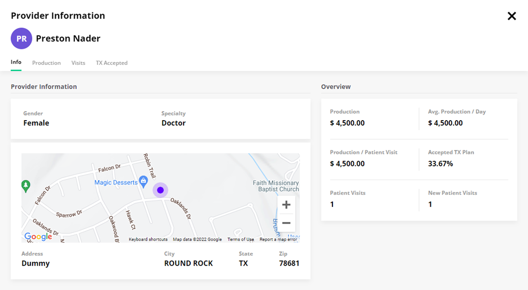 · Production – Click to view the selected provider's production and production per visit for the selected day or date range.