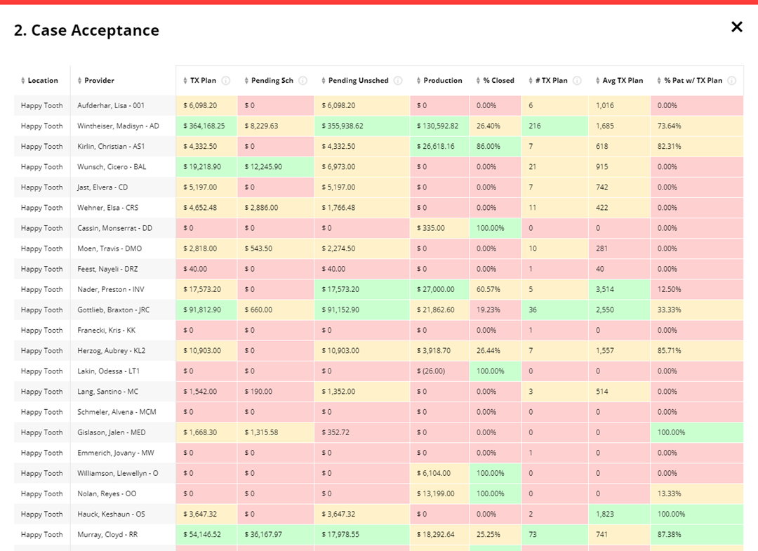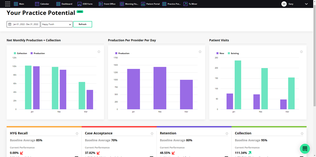You can use the Practice Potential module to show potential revenue opportunities in three key areas: Hygiene Recall, Case Acceptance, and Patient Retention.