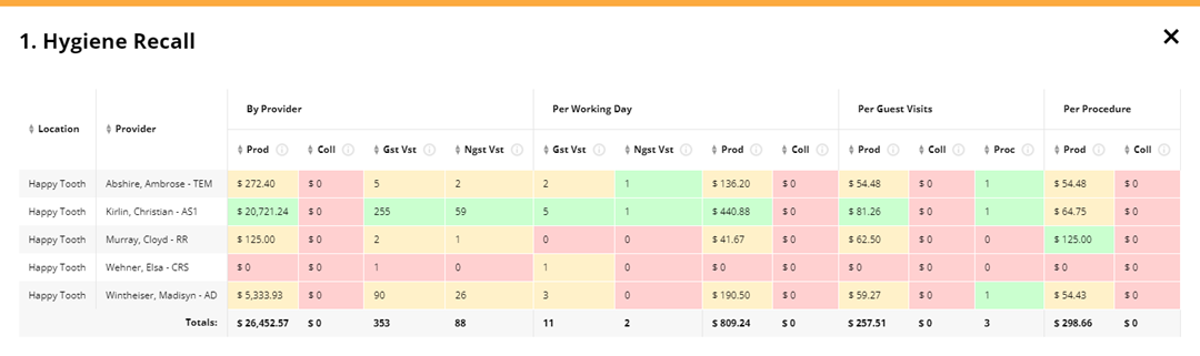 Note: The first tables display the key practice metrics per month: Net Monthly Production and Collection, Production Per Provider Per Day, and Patient Visits.