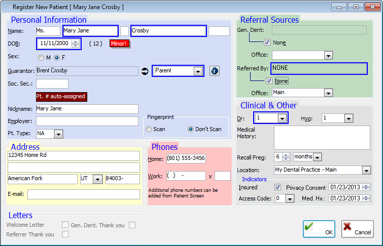 Select the check boxes of any Letters that you want to print for the patient: Welcome Letter, Referrer Thank you, and/or Gen. Dent. Thank you.