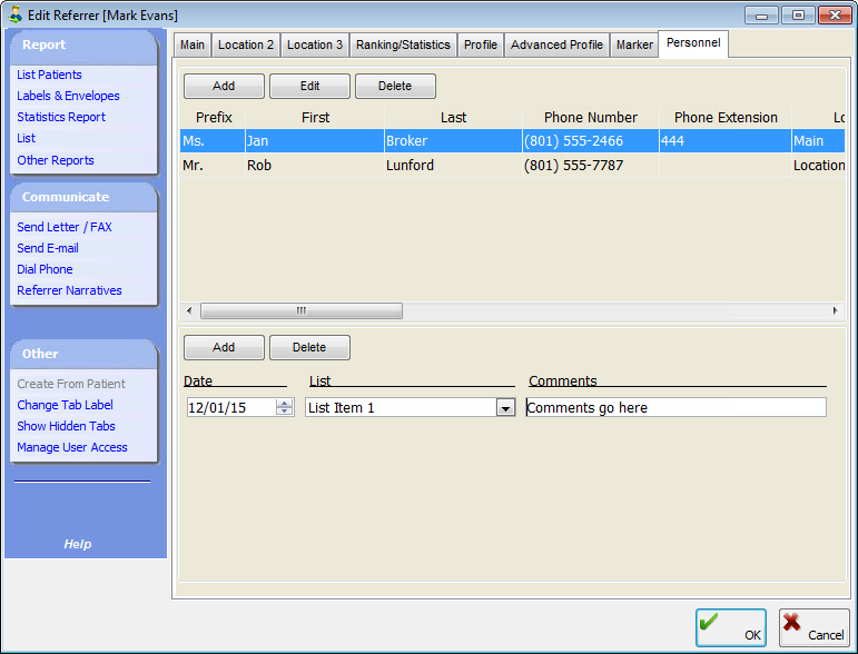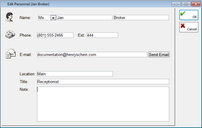 Add - Click this button to open the Edit Personnel dialog box to add personnel. Enter the Name, Phone number and extension, E-mail (you can click Send E-mail to send an email message to the specified address), and Title of the person. Also, select the Location where the person works (the locations correspond to the location tabs across the top of the Edit Referrer dialog box), and write any Notes pertinent to the person. Then, click OK to save the information.