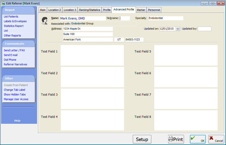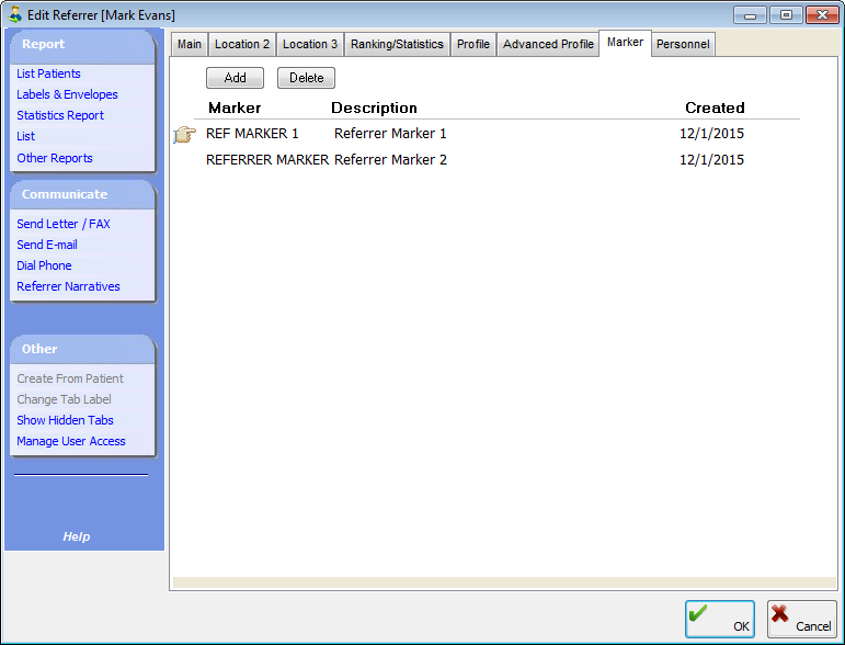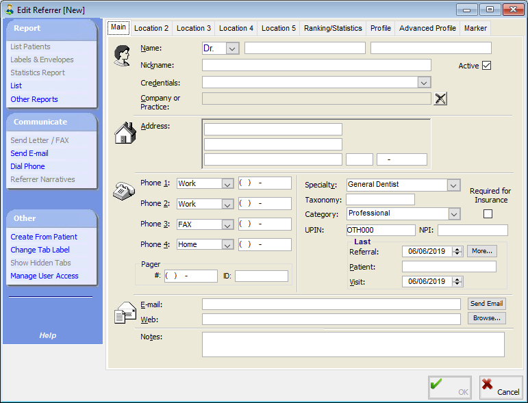 Referrers are professional, personal, patient, and marketing (such as an advertisement in the phone book or on the internet) referral sources you can create and maintain profiles for. You can add and edit referral source profiles as needed.