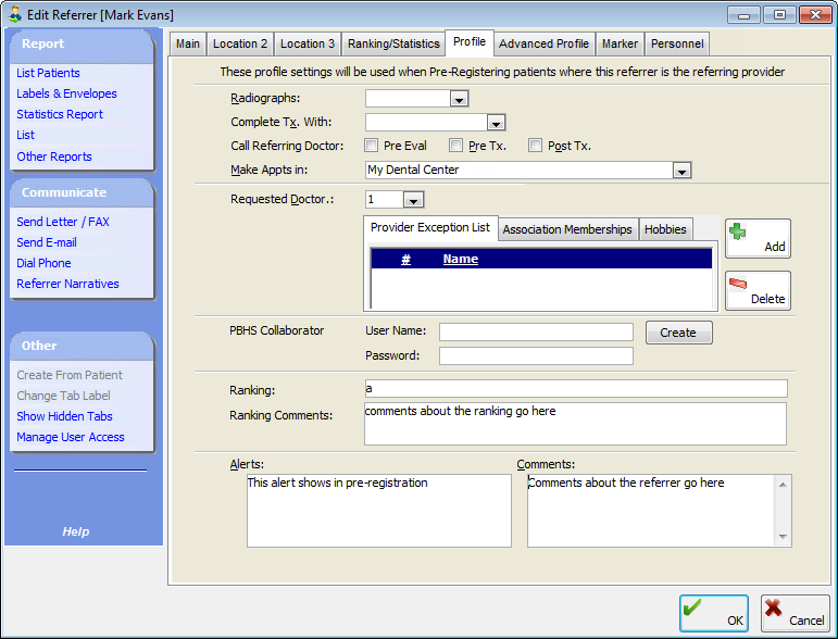 The Profile tab stores the settings that will be used when pre-registering patients that have this referrer attached.