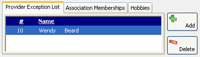 Provider Exception List - This tab is selected by default. To exclude a provider that a referring doctor does not want his or her patients to see, click Add to select and paste in a provider. To remove a provider from the list, select the provider, and then click Delete.