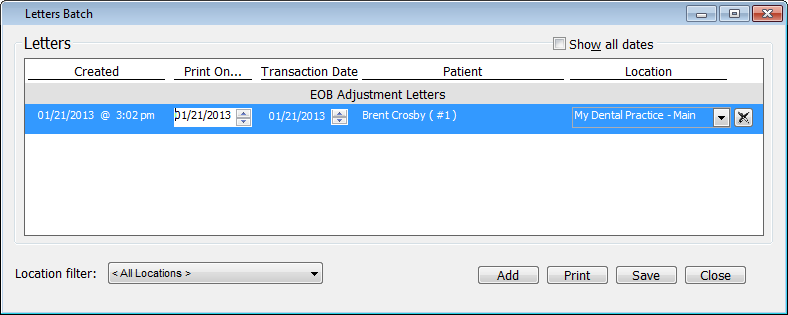 For each letter you select, select when you want to Print the letter; or leave "Today" selected. You can change the Print On and Transaction Date dates, as well as the Location, at any time in the Letters Batch dialog box.