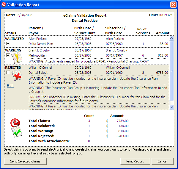 If there are any claims with the status of Warning or Rejected, click Print Report to view and print the Validation Report. You can use this report to see which errors need to be corrected on certain claims before they can be sent.