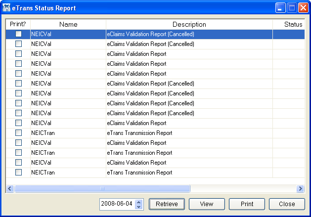 From the eTrans Status Report dialog box, you can view and print eTrans reports for a specific date. This dialog box appears after you finish sending your e-claims or if you cancel out of the transmission. Alternately, to open this dialog box at any time, from the Report menu, point to Insurance > eTrans, and then click eTrans Status Report.